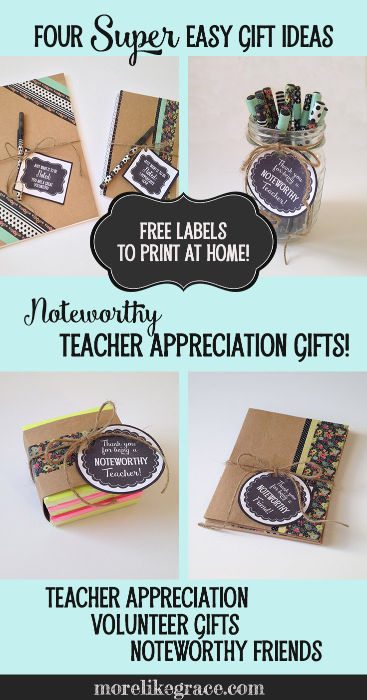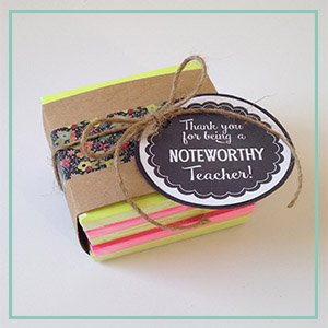 Make these Washi tape cards (or buy some cute notecards at the store). Tie together with a ribbon or string. Punch hole in the “Noteworthy” label and add to the string before tying the bow. Add a decorative pen for a another special touch.
