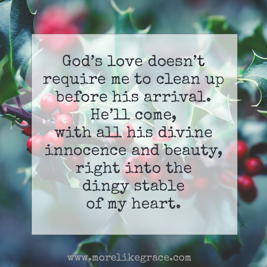 Because at some point, the Christmas story finally penetrated my paralyzed heart. One day, I finally gave up the pride of thinking my work could earn God’s approval, or that my failings could foil his plans. One day, I finally understood that God’s love doesn’t require me to clean up before his arrival. That he’ll come with all his divine innocence and beauty, right into the dingy stable of my heart.