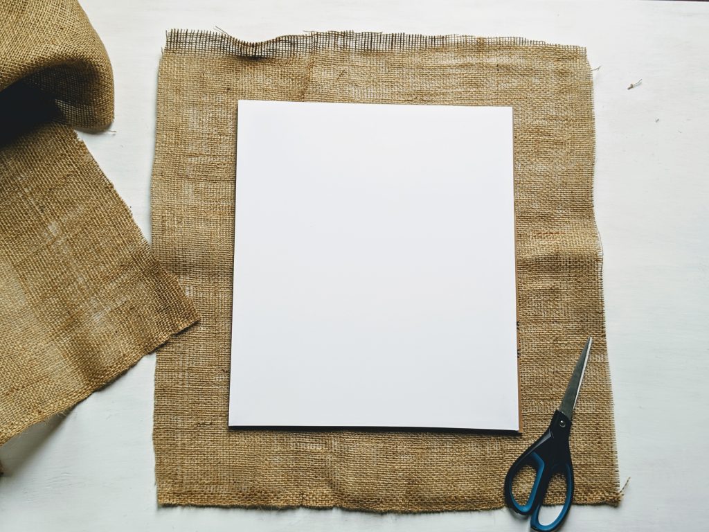 Lay your foam board piece on top of your burlap and cut out a piece of burlap, leaving about 2 – 3″ of extra fabric on every side. Â (These edges will be hidden, so it’s okay if they are not perfectly straight.)