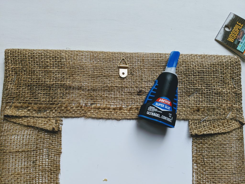 Clip your artwork to the clothespins and get it centered the way you want it to appear.  Now squeeze a bit of glue on the back of each clothespin  (I LOVE this super glue because I never get it on my fingers with the handy squeeze bottle!)  Quickly center your artwork on the front side of your burlap frame and then press the clothespins into place so the glue will adhere.