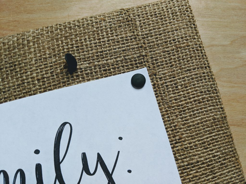 Mark a small dot on each corner of your artwork/print, about 1 cm from each side. Â Center your artwork on the front side of your burlap-covered board, and attach by pushing thumbtacks through the dots you marked.