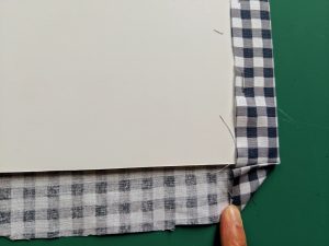 Place your trimmed foam board on your fabric and trim your fabric, using a scissors, to about a 1″ to 1.5″ border around your foam board. (The cut edges will not show when you’re done, so it’s not too picky that you have perfectly straight edges.)