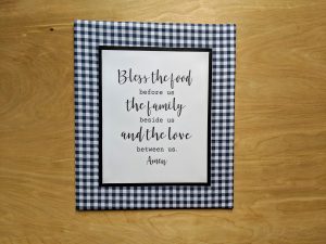 I already had the foam board and other supplies on hand, so I printed off the “In This Kitchen” print I wanted to feature and set to work crafting these diy home decor pieces. I was excited to discover that the fabric I used seemed custom-made to match the Pioneer Woman sugar jar and creamer that add a touch of nostalgia to my kitchen window sill. The finished print fits in just perfectly with my kitchen!