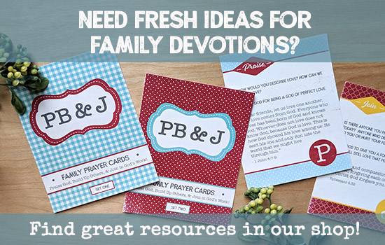 Meaningful meals don’t happen by accident: They happen by design. But these designs don’t have to be complicated! It doesn’t take an 18-point process and coler-coded binder in order to teach kids about Jesus. “Planning ahead” can be as simple as jotting an idea on a sticky note or printing off a blog post (like this one!) to keep by the table. Or maybe it’s picking up a devotional book, prayer prompts, or Bible study guide that’s ready to go at mealtime. (I’ve got a few great options in the shop right here!)