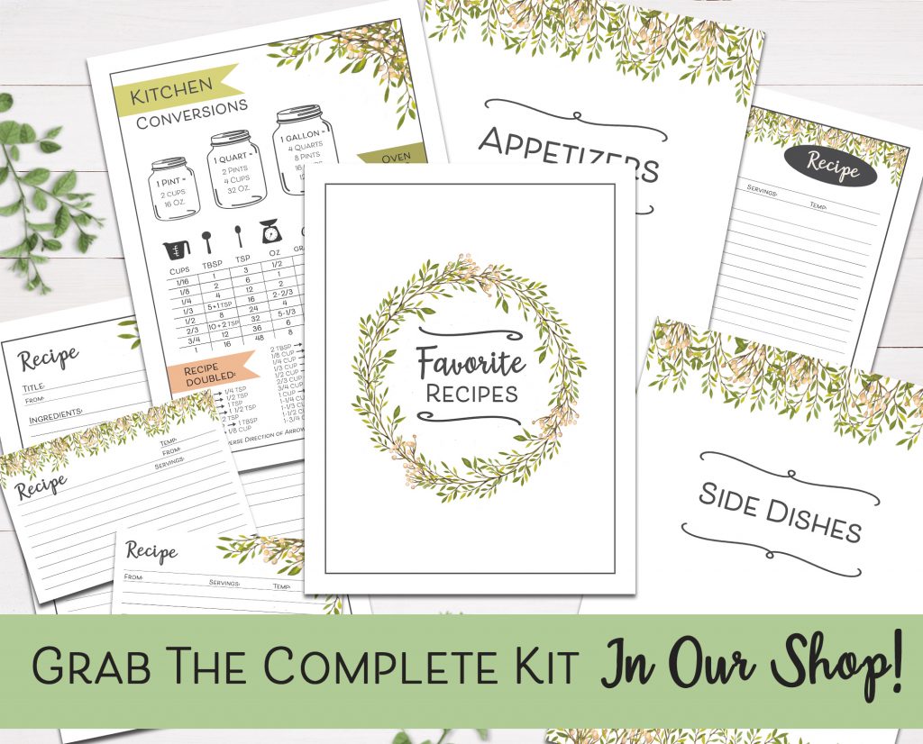 You can grab the free printable recipe cards and pages by clicking the blue button at the end of the post. But if you really want to tackle your recipe organization (or you’re just looking for a fun gift idea), check out a variety of printable binder sets in my Etsy store: They’ve got a matching recipe binder cover, divider pages and tabs, and a handy kitchen conversion you can include too! Plus, there’s cover options for “Mom” and “Grandma” if you’d like to put together a great Mother’s Day gift right from home.