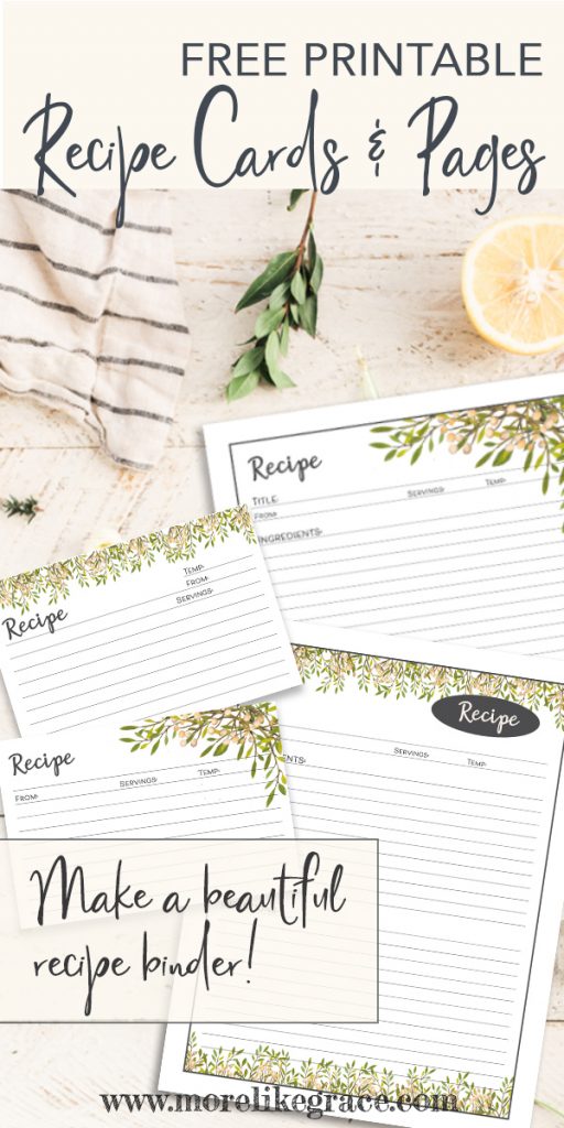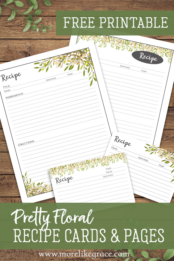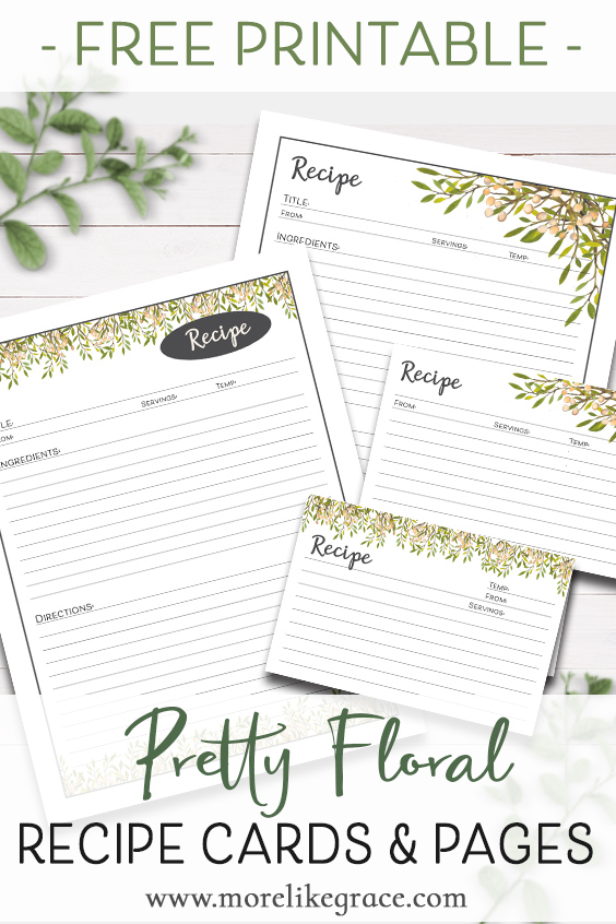 I added a couple of pretty, floral recipe binder kits to my Etsy shop recently—they’re printable files you can use to collect all your favorite recipes into one convenient place. But for my More Like Grace readers, I wanted to share some of the goodies from those kits for free, so I’m offering a set of free printable recipe cards and recipe pages to you!