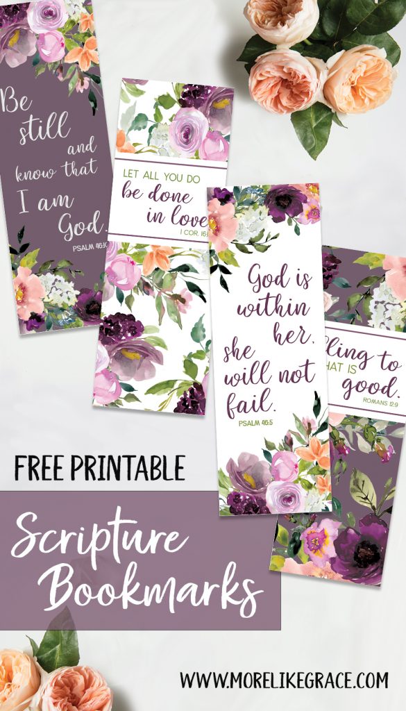 It’s time for another free printable, don’t you think? This time I’m sharing some pretty bookmarks, just in time for chilly fall evenings spent cozying up and reading good books. Hopefully, their purple floral design (borrowed from my personal favorite journal from More Like Grace’s collection) will bring a bit of summer into the wintry days ahead. But even more so, I hope their encouraging Scripture messages will offer seeds of encouragement that blossom into courage, kindness, and peace in your everyday, ordinary life.
