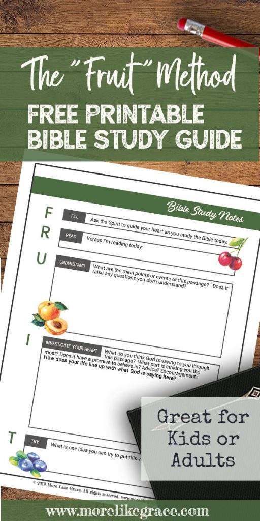 But I also wanted to share a simple, free printable version of the FRUIT Bible study that you can use for yourself or your kids when you’re studying any part of God’s Word. The free downloadable study sheet explains each step of the “FRUIT” Bible study and leaves empty spaces where you can write down the things you’re learning along the way.