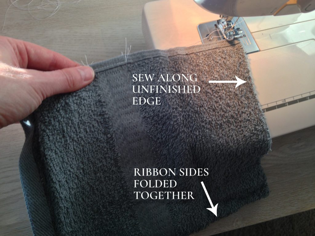 9. Fold your hood piece in half, with the ribbon sides facing in. Leaving a quarter inch seam allowance, sew a line along the unfinished edges of the towel. Reinforce by sewing another line at a half inch seam allowance from then edge.