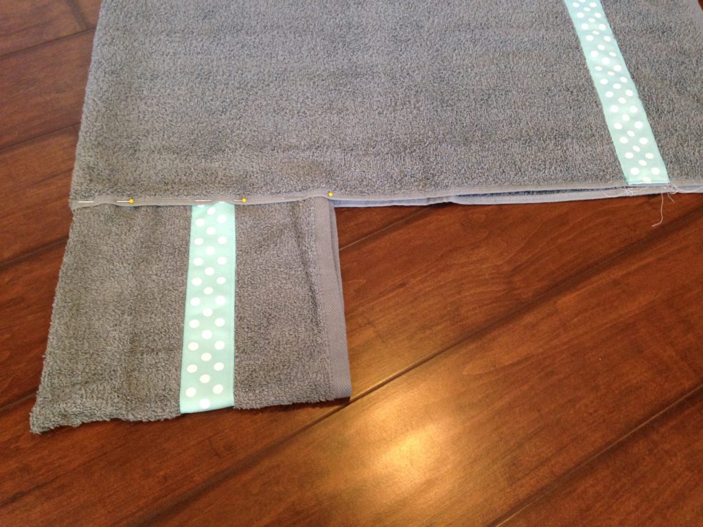 5. Fold one end of the shorter ribbon under and align edge with the shorter side of your hooded piece. (See picture following Step #6.) I usually place the ribbon about three inches from the longer, finished edge of the towel.