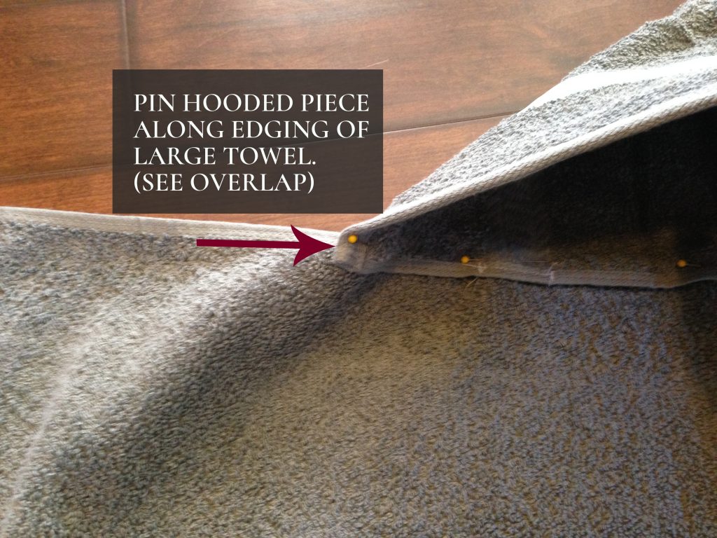 11. Pin the hooded piece into place. (Picture below shows what it should look like when you open the larger towel back up a bit.)