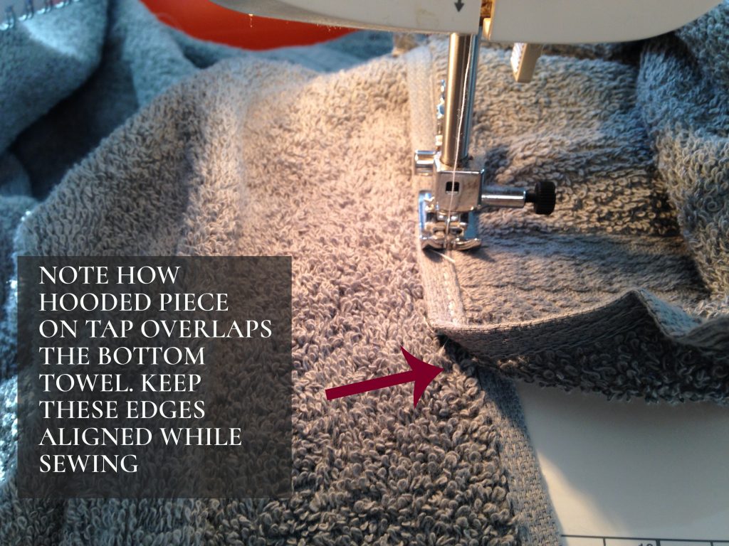 12. Sew the hooded piece into place by sewing a straight line along the edge. (Try to align your big bath towel and and the hooded piece as pictured below.) Reinforce by sewing a second seam next to the first.