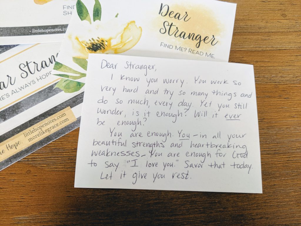 - Grab the FREE Printable “Dear Stranger” notes below: They include website info so people can learn more about Little Hope Notes and spread some hope of their own
