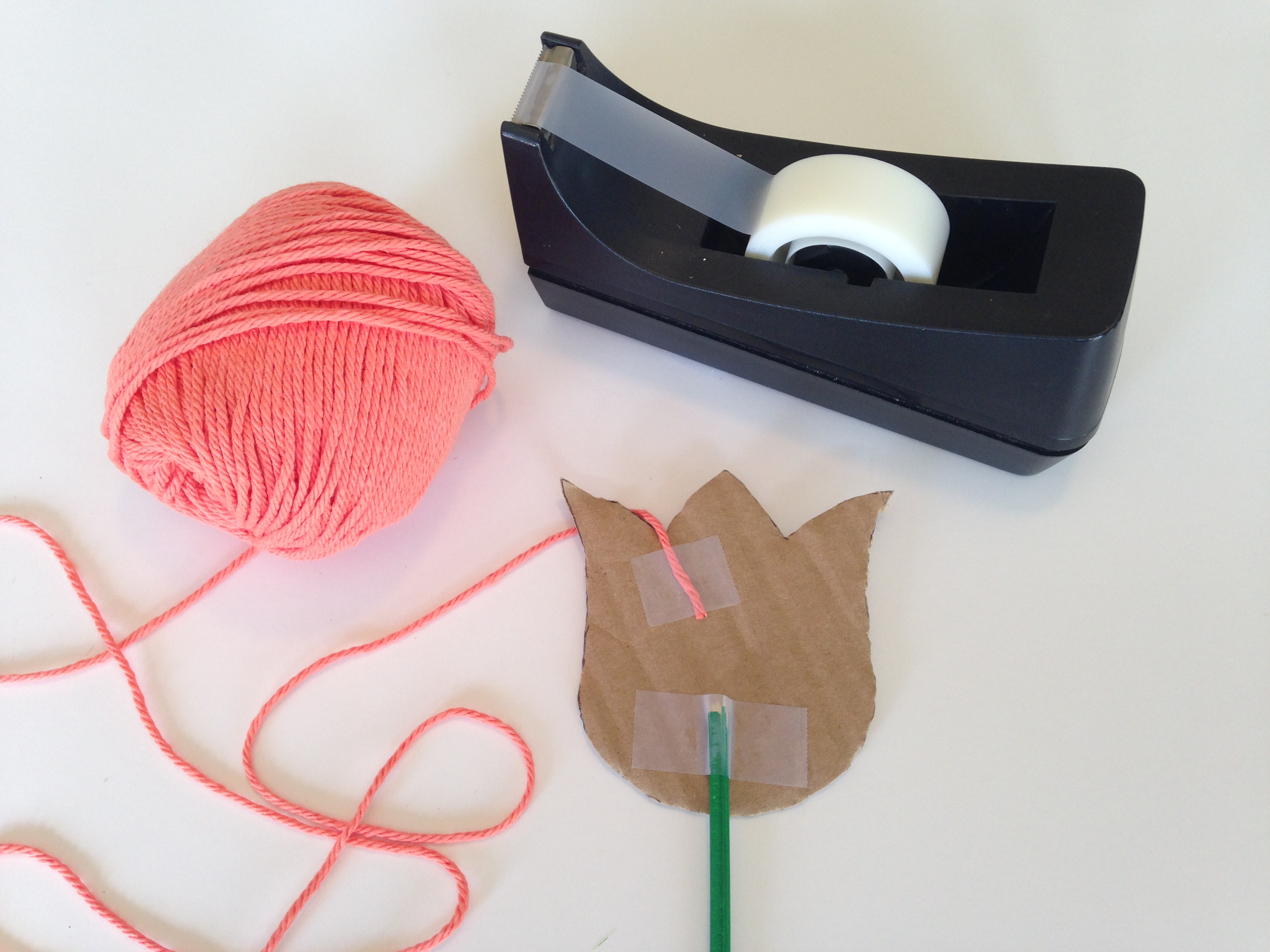 - Attach your “stem” (aka. popsicle stick, dowel, or floral stem) to the cardboard piece using tape. Then tape the end of your yarn to the back side of your cardboard shape.