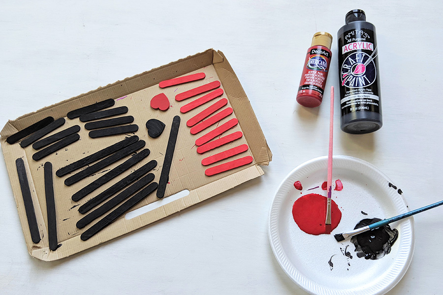 - PAINTING: For ornaments with solid-color base: Paint 6 short popsicle sticks (for sled top) and 2 long popsicle sticks (for sled runners) using black or red acrylic craft paint. For ornaments with washi-tape base: Paint 2 long popsicle sticks (sled runners) in black acrylic paint. If you want a painted heart on your finished ornament, go ahead and paint the heart now too. I did two coats of paint for all painted surfaces on my ornaments.