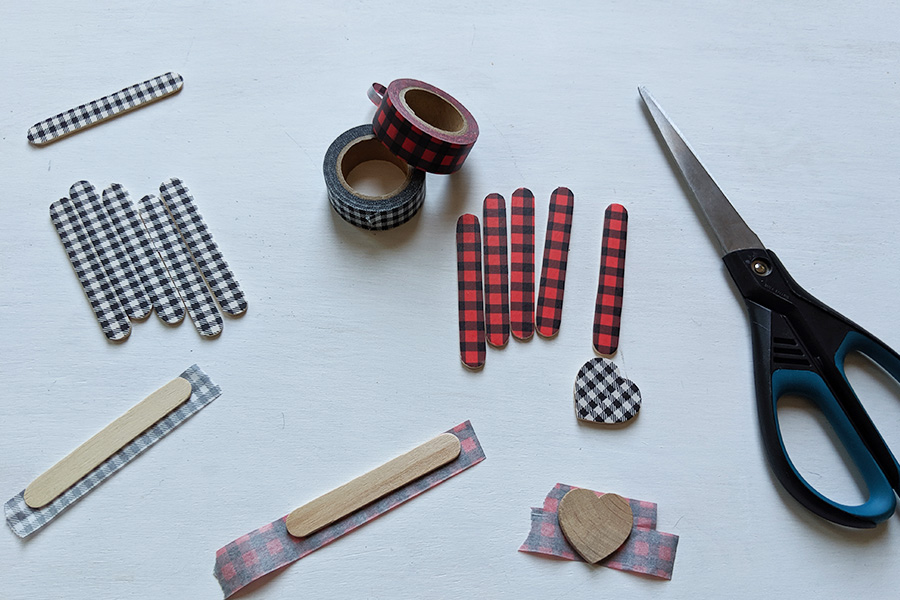 - WASHI TAPE: For ornaments with washi-tape base, lay your 6 base popsicle steps on top of pieces of washi tape, then use a scissors to trim the excess from around the edges. Also put washi-tape on your wooden hearts, using two strips of washi tape placed carefully so the plaid edges line up. (For the red and black plaid washi tape, I had to carefully trim the edge of one washi tape pieces so the plaid would line up: If you look below, you can notice how the top piece under the heart is slightly narrower than the bottom piece.)