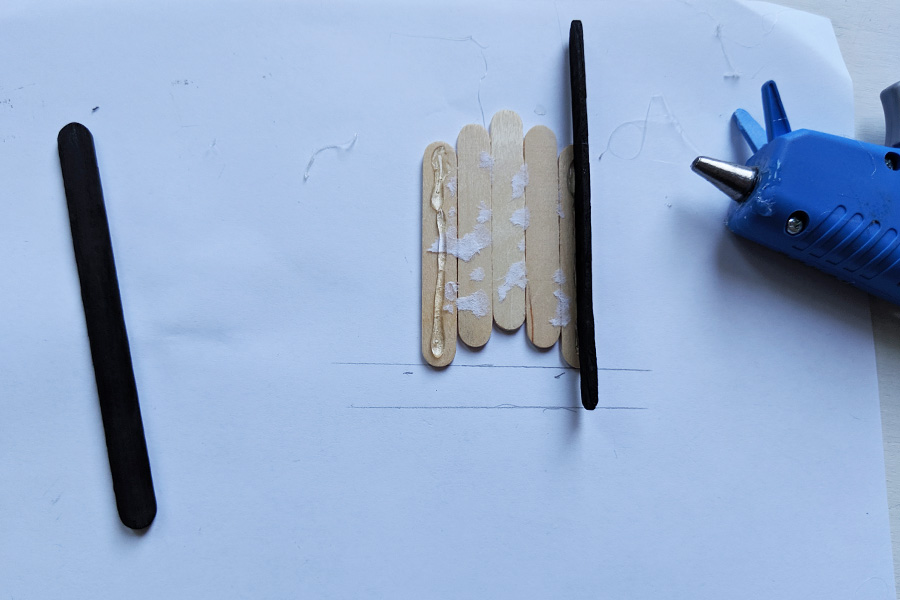 - GLUE: Use tacky glue to connect five of the mini popsicle sticks together, creating your sled base. Line the three center piece in an even row, and then place the two side pieces about 1/4-1/2″ lower on each side. (I used a toothpick to spread the glue along the edges.)