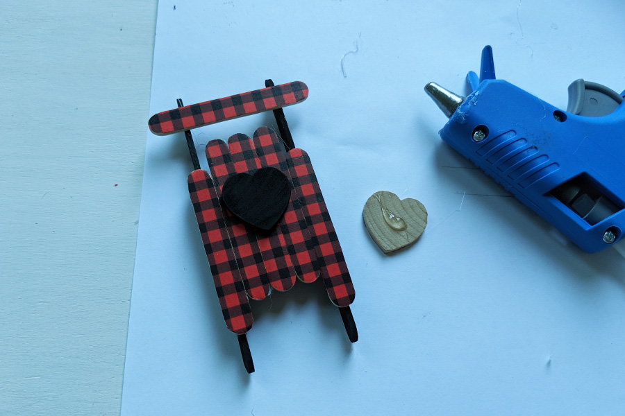 - HOT GLUE: Use the hot glue gun to attach your heart to the front of the sled, and to attach a mini popsicle stick across the top of your sled runners at the top.